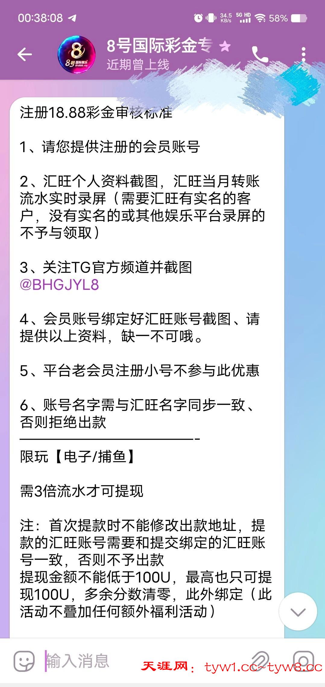 新人注册送18.8U,注册账号绑定出款账号 联系飞机客服@BHGJYLCJ01领取,要录制流水视频。限制电子捕鱼3水,最低最高提100u,我给欧易流水也给了